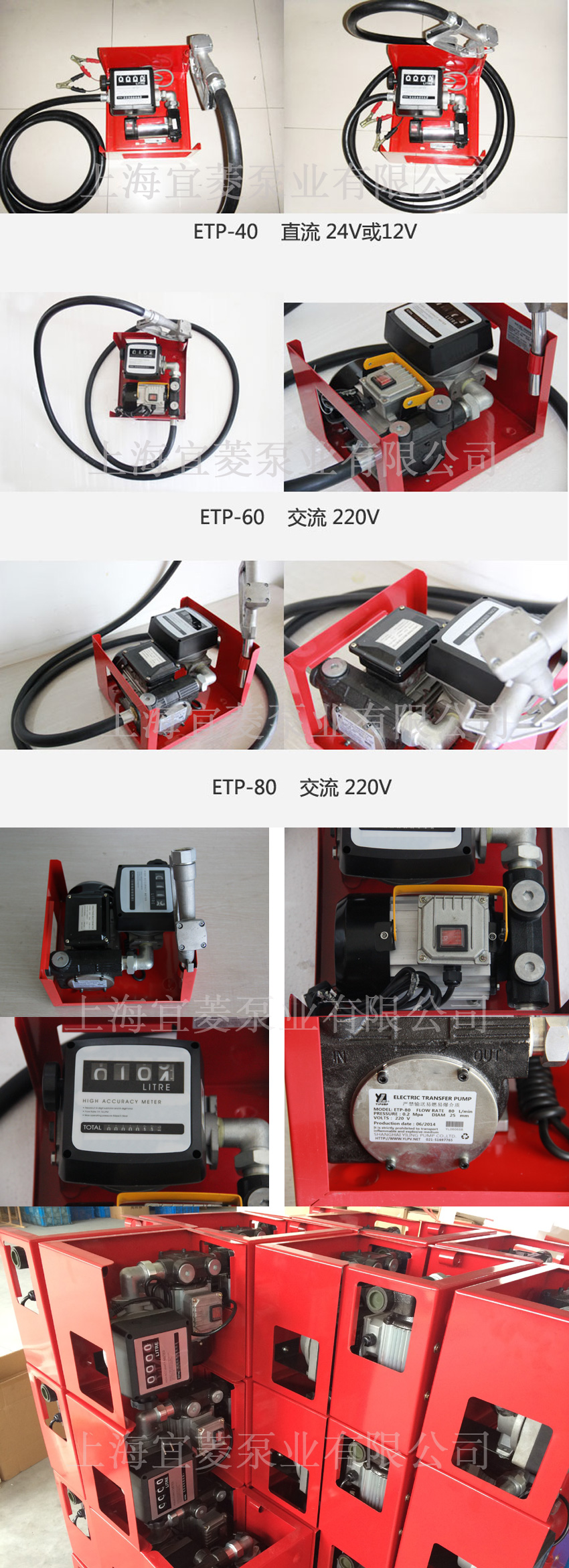 ETP系列电动油泵由电机、油泵、流量表组成 、它具有携带方便、可靠性高、操作快捷、维护简单、使用简单等特点。它能显示单次加油体积,累计加油体积,单次加油完毕只要调节至零手轮可将数据清零。